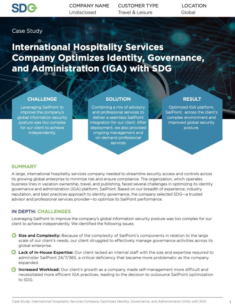 A large, international hospitality services company needed to streamline security access and controls across its growing global enterprise to minimize risk and ensure compliance. The organization, which operates business lines in vacation ownership, travel, and publishing, faced several challenges in optimizing its identity governance and administration (IGA) platform, SailPoint. Based on our breadth of experience, industry reputation, and best practices approach to identity governance, the company selected SDG—a trusted advisor and professional services provider—to optimize its SailPoint performance.