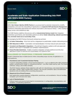 SDG’s NHID Factory is a repeatable onboarding accelerator that standardizes how applications and non-human identities are integrated into CyberArk PAM. It replaces manual, one-off onboarding with defined intake, decision trees, templates, and governance, typically delivering faster onboarding with less effort while improving auditability and consistency.
